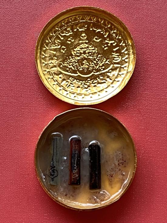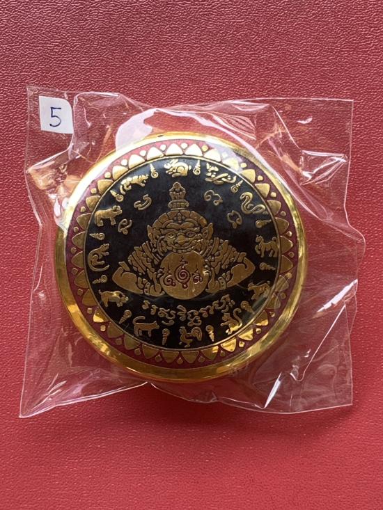 เคาะเดียวแดง สีผึ้งพระราหู รุ่น มงคลจักรวาล เนื้อ โลหะชุบทองลงยาสีดำขอบสีแดง ขนาด5ซม |