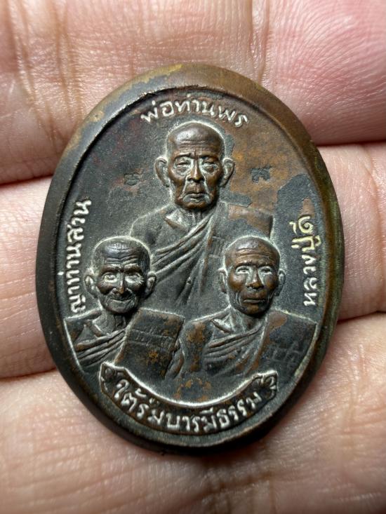 3. เหรียญหล่อโบราณ บูชาบุรพาจารย์ "ใต้ร่มบารมีธรรม" ด้านหน้า ญาท่านสวน พ่อท่านพร หลวงปู่ดี ด้านหลัง ญาท่านเกษมถือขันบูชา สร้าง 2999 เหรียญ