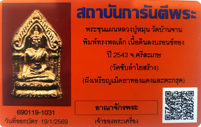 พระขุนแผน หลวงปู่หมุน วัดบ้านจาน พิมพ์ทรงพลเล็ก เนื้อดินลงบรอนซ์ทอง ปี 2543 จ.ศรีสะเกษ ( วัดซับลำใยสร้าง ) ฝังเหรียญเม็ดยาทองแดง, ตะกรุด3กษัตริย์, เกศา, จีวร, พลอยเสก พร้อมบัตรรับรอง สภาพสวย ### 222 ###