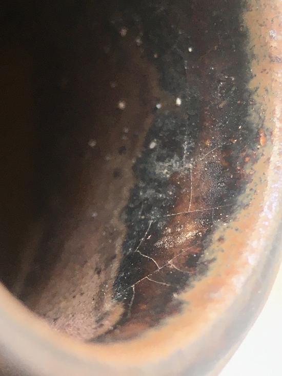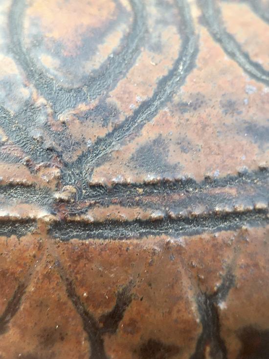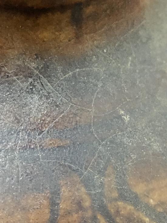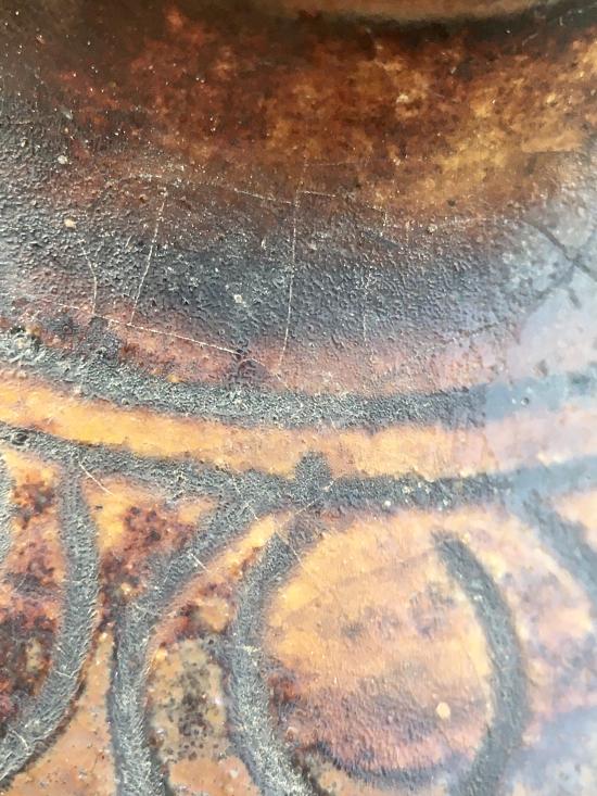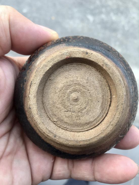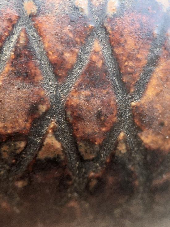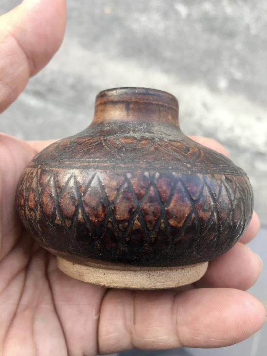 เครื่องปั้นดินเผาโบราณ ศิลปะสุโขทัย คนโทเล็กเคลือบสีน้ำตาล ขูดลายสี่เหลี่ยมข้าวหลามตัด ขึ้นรูปด้วยแป้นหมุน อายุการสร้างอยู่ในช่วงพุทธศตวรรษที่ 17-18 ขนาด กว้าง 72 มม สูง 55 มม ปากกว้าง 20 มม สภาพสมบูรณ์ ไม่แตก ไม่ซ่อม