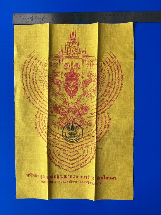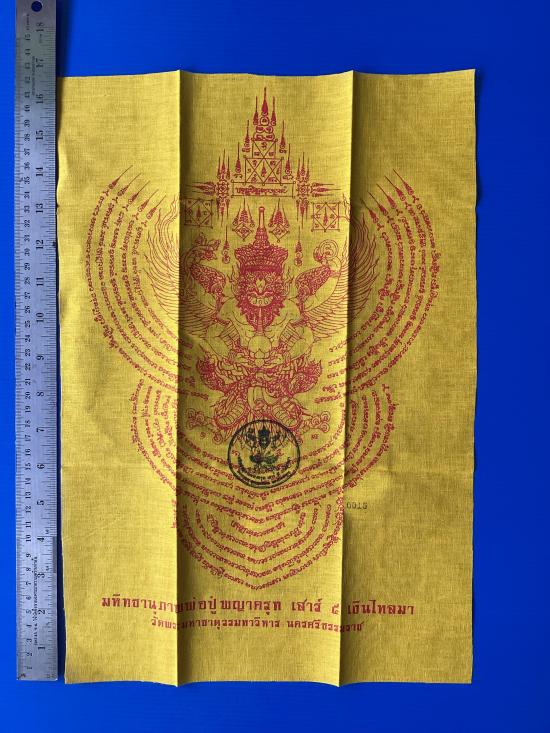 ผ้ายันต์ พญาครุฑเสาร์5 เงินไหลมา วัดพระมหาธาตุวรมหาวิหาร จ.นครศรีธรรมราช สีเหลือง ขนาด A 3 ( 11.5 นิ้ว x 16.5 นิ้ว )
