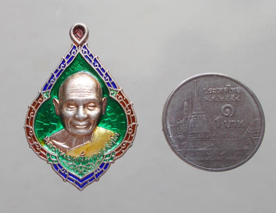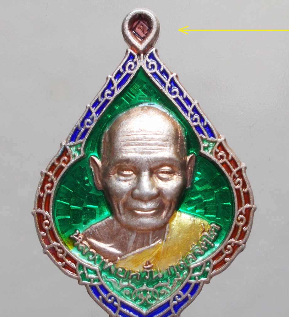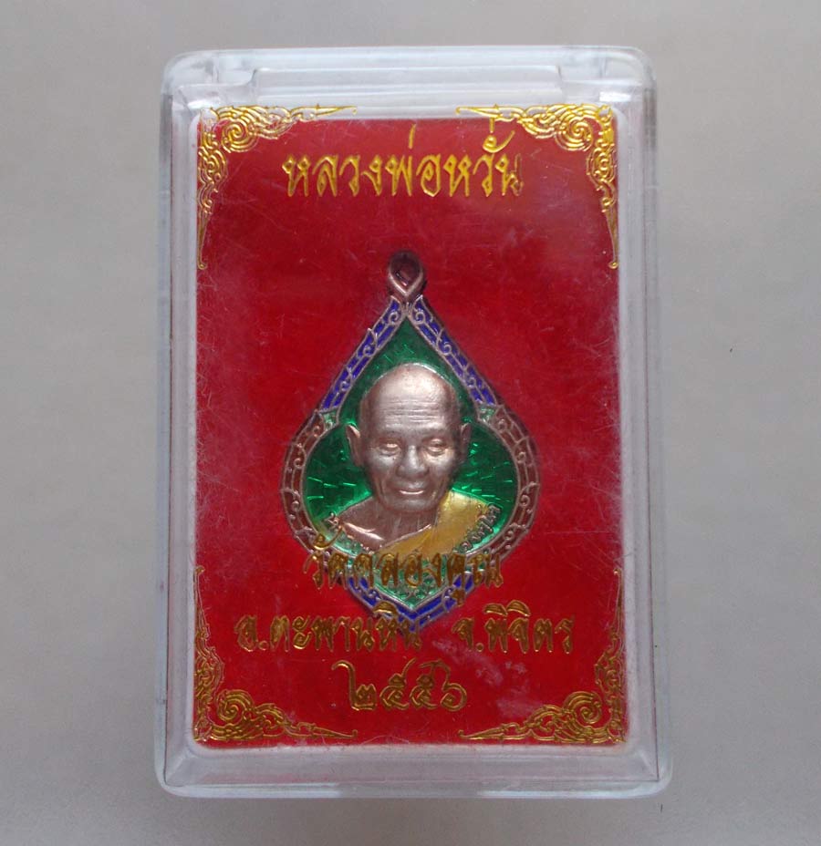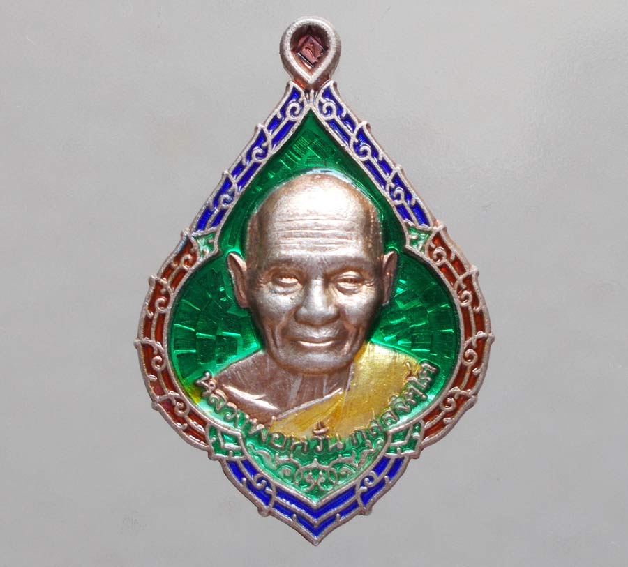 เหรียญใบสาเก หลวงพ่อหวั่น กุศลจิตฺโต วัดคลองคูณ พ.ศ.2556 เนื้อเงินลงยา 4 สี ( พึ้นสีเขียว ) ตอก 2 โค๊ต ตอกเลข กล่องครบ !!