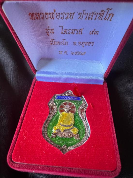 ชื่อพระเครื่อง HOT!!! เหรียญไตรมาส 93 เนื้อเงินลงยาสีเขียว ปี 2557 เลข 599 หลวงพ่อรวย วัดตะโก พร้อมกล่องเดิม