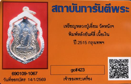 (เคาะเดียวแดง) เหรียญหลวงปู่เอี่ยม วัดหนัง หลังยันต์สี่ (นิยม) เนื้อเงิน ปี 2515 สภาพสวยแชมป์ พร้อมเลี่ยมเงินแท้ + บัตร G-Pra