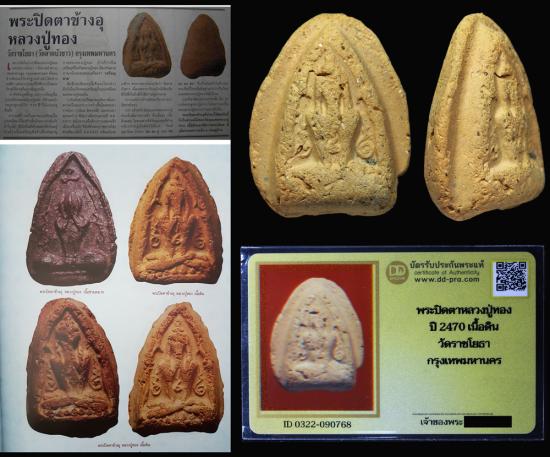 พระปิดตาข้างยันต์ พิมพ์หัวจรวด หลวงปู่ทอง วัดราชโยธา (วัดลาดบัวขาว) กทม. ปี 2470 (เนื้อดิน) จัดเป็นพระเครื่องระดับ "ปรมาจารย์" ที่นักสะสมรุ่นเก่าให้ความเคารพสูงสุดครับ เพราะ หลวงปู่ทอง ท่านคือสุดยอดพระเกจิผู้มีอายุยืนยาวถึง 117 ปี และเป็น "ครูของครู" (อาจารย์ของพระเกจิชื่อดังหลายท่าน)