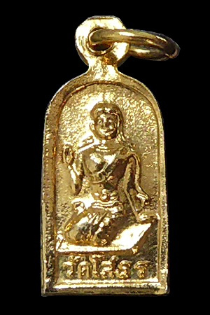 เหรียญใบมะขามพระพุทธโสธรหลังนางกวัก (นางกวัก เป็นเครื่องรางของขลัง ที่นิยมในหมู่พ่อค้าแม่ค้า มีพุทธคุณเด่น ในด้านกวักโชคกวักลาภ กวักเงิน กวักทอง เรียกเงินเรียกทองให้ไหลมาเทมา เป็นมหาเสน่ห์ใครเห็นใครรัก เมตตามหานิยม ทำให้ค้าขายดี มีความเจริญรุ่งเรืองในด้านการค้าขาย) เนื้อทองแดงกะไหล่ทอง ขนาดสูงประมาณ 2 ซ.ม. (รวมห่วง) ส่วนกว้างสุดประมาณ 0.8 ซ.ม. สภาพสวยมาก ผิวกะไหล่ทอง