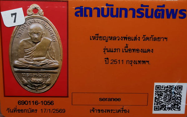 เหรียญหลวงพ่อเส่ง วัดกัลยาฯ เนื้อทองแดง ปี2511 จ.กรุงเทพฯ + บัตรG-pra สภาพเดิมค่ะ สภาพตามรูปทุกประการค่ะ