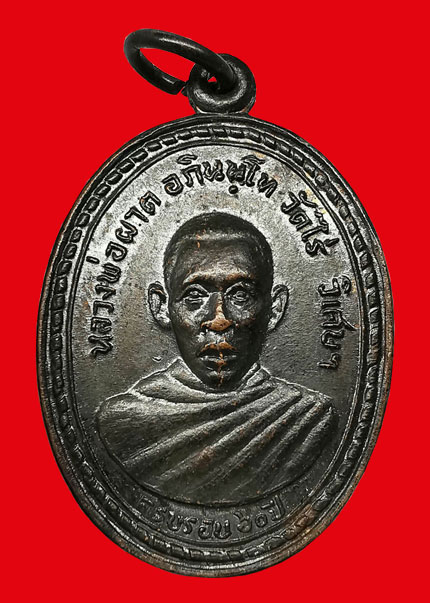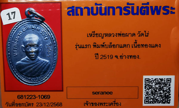 เหรียญหลวงพ่อผาด วัดไร่ รุ่นแรก พิมพ์บล็อกแตก เนื้อทองแดง ห่วงเดิม ปี2519 จ.อ่างทอง + บัตรG-pra สภาพเดิมค่ะ