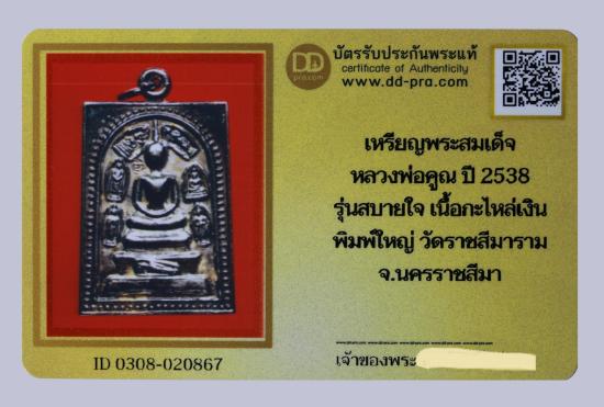 เหรียญพระสมเด็จ หลวงพ่อคูณ ปี 2538 รุ่นสบายใจ เนื้อกะไหล่เงิน พิมพ์ใหญ่ วัดราชสรมาราม จ.นครราชสีมา น่าบูชามากๆค่ะ+บัตร