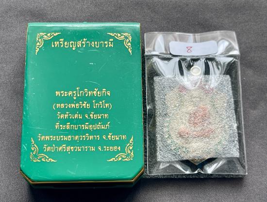 เหรียญเสมาสร้างบารมี หลวงพ่อวิชัย วัดหัวเด่น "เนื้ออัลปาก้าลงยา 3 สี" (เหรียญลุ้นพิเศษ) เลขสวย "8" มงคลรวย |