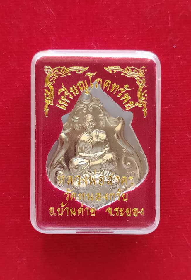 เหรียญโภคทรัพย์(ขี่เต่า) หลวงพ่อสาคร วัดหนองกรับ จ.ระยอง ปี 2552 เนื้ออัลปาก้า no.3851 กล่องเดิม พิธีพุทธาภิเษก ปลุกเสกเดียวนานเกือบ 2 ชั่วโมง ไม่น่าเชื่อ ก็ต้องเชื่อ ขณะเริมพิธีพุทธาภิเษก ฝนตกหนัก พอจบพิธี และดับเทียนชับ ฝนหยุดตก เป็นพระเกจิชื่อดังแห่งเมืองระยอง ศิษย์เอกหลวงปู่ทิม เพื่อศึกษาพระธรรมวินัย และพุทธาคมจากหลวงปู่ทิมวัดละหารไร่อย่างจริงจัง หลังจากนั้นจึงได้รับการถ่ายทอดวิชาอาคมต่างๆ จากหลวงปู่ทิม จนหมดสิ้นโดยมิได้ปิดบังแต่อย่างใด เรียกได้ว่าเรียนได้กระจ่างชัดรู้จริง สามารถปฏิบัติได้เมื่อมีความเชี่ยวชาญในคาถาอาคมต่างๆ ที่เรียนแล้วด้วยใจรักในด้านนี้ ต่อมา จึงได้เสาะแสวงหาศึกษาวิชาอาคมจากหลวงพ่อเพ่ง สาสโน วัดละหารใหญ่ ซึ่งหลวงพ่อเพ่ง เดิมเป็นมหาดเล็กในสมเด็จเตี่ย กรมหลวงชุมพรเขตอุดมศักดิ์ฯ จึงได้ศึกษาอาคมจากหลวงปู่ศุข วัดปากคลองมะขามเฒ่า มีวิชาด้านคงกระพันเป็นเยี่ยมเขียนอักขระลงบนแผ่นตะกั่วเพียงตัวเดียวให้คนทดลองยิงแต่ก็ยิงไม่ออก จนโด่งดังเป็นที่ศรัทธาของลูกศิษย์จนทุกวันนี้ พุทธคุณดีเด่นด้าน เมตตามหานิยม โชคลาภ อุดมทรัพย์ แคล้วคลาดปลอดภัยอันตรายทั้งปวง |