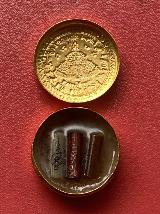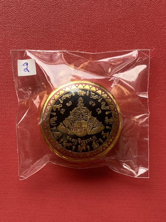เคาะเดียวแดง สีผึ้งพระราหู รุ่น มงคลจักรวาล เนื้อ โลหะชุบทองลงยาสีดำขอบสีแดง ขนาด 3.2ซม |