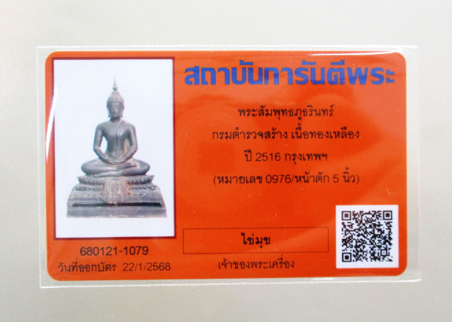 พระสัมพุทธภูธรินทร์ พระบูชารุ่นแรกของกรมตำรวจ ในหลวงรัชกาลที่ 9 เสด็จเททอง พ.ศ.2516 หน้าตัก 5 นิ้ว เนื้อโลหะรมมันปูผิวหิ้ง ดินไทยสีดำ-แดง ตอกโค๊ต ตอกเลข หายากครับ !!