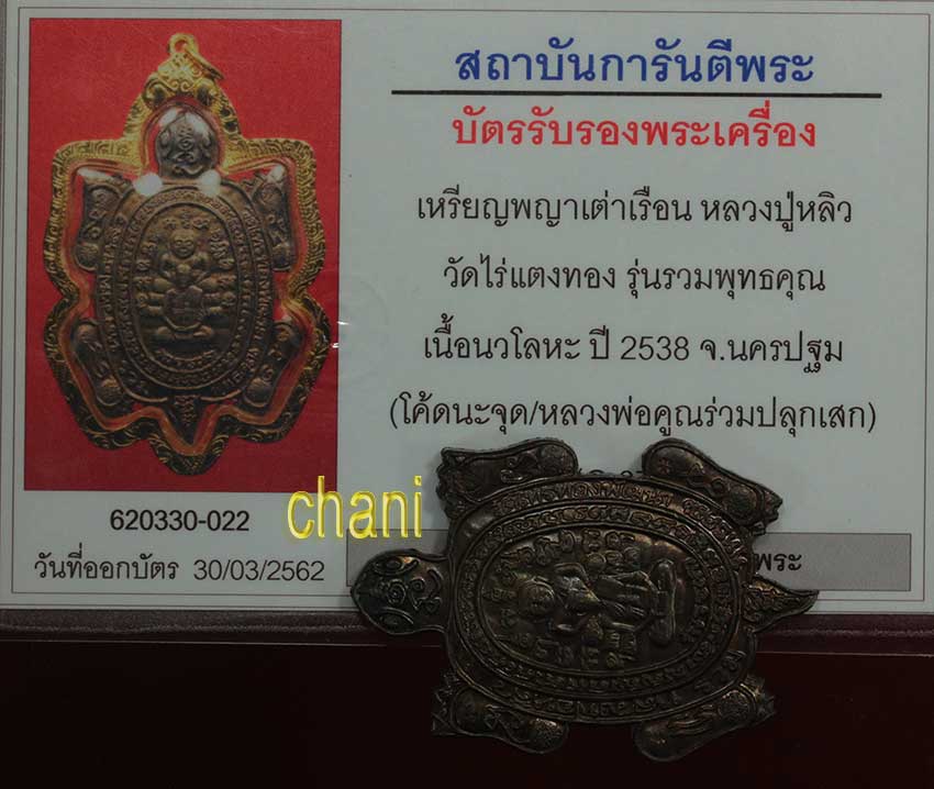 เหรียญ หลวงพญาเต่าเรือน หลวงปู่หลิว วัดไร่แตงทอง รุ่นรวมพุทธคุณ โค๊ตนะจุด เนื้อนวะโลหะ ปี2538 จ.นครปฐม สภาพเดิมๆ พร้อมบัตรรับรองพระแท้จากจีพระ อุ่นใจได้ค่ะ