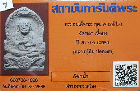 สมเด็จพุฒาจารย์(โต) วัดพลา เนื้อผงเหลือง ปี2510 พร้อมบัตร7