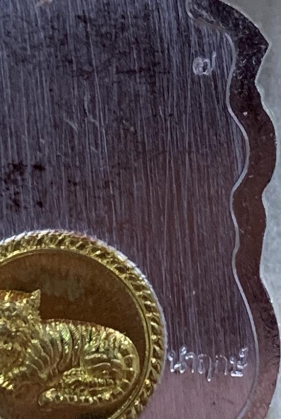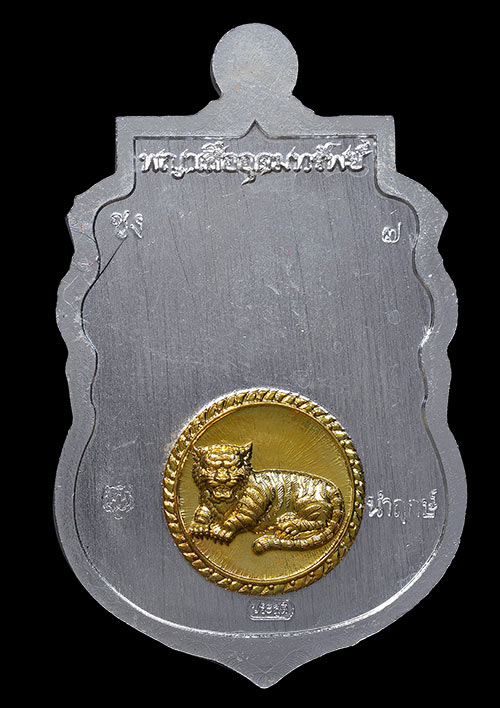 1 ใน 10 เหรียญเสมาพญาเสืออุดมทรัพย์ พระอาจารย์ประสูติ (หลวงพ่อประสูติ) วัดในเตา จ.ตรัง เนื้อชุบเงินลงยาแดงลงยาขอบพญานาคลงยาจีวร ฝังพลอยขาว บล็อคหลังเรียบเสือติดหน้ากากทองระฆังเสือ เลขสวยหลักเดียวNO.7