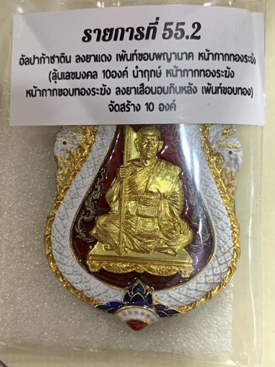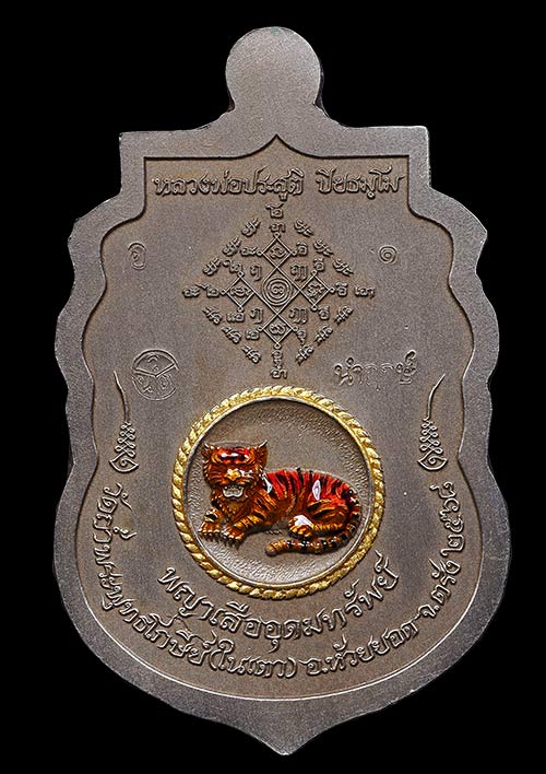 1 ใน 10 เหรียญเสมาพญาเสืออุดมทรัพย์ พระอาจารย์ประสูติ (หลวงพ่อประสูติ) วัดในเตา จ.ตรัง เนื้ออัลปาก้าซาตินลงยาแดงเพ้นท์ขอบพญานาคหน้ากากทองระฆัง ขอบทองระฆังลงยาเสือนอนกินเพ้นท์ขอบทอง เลขเสวยNO.1
