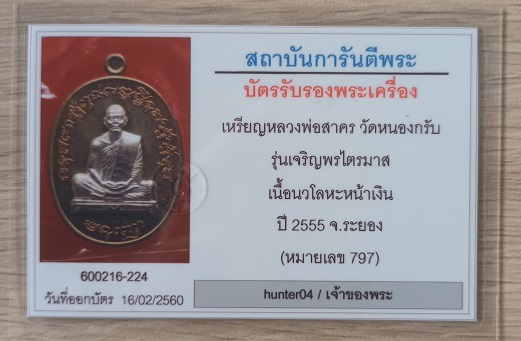 เหรียญไตรมาสเจริญพร{รุ่นประสบการณ์ฟ้าผ่า} หลวงพ่อสาคร ออกวัดหนองกรับ ปี 55 เนื้อนวะหน้าเงิน No.797 เลขสวย