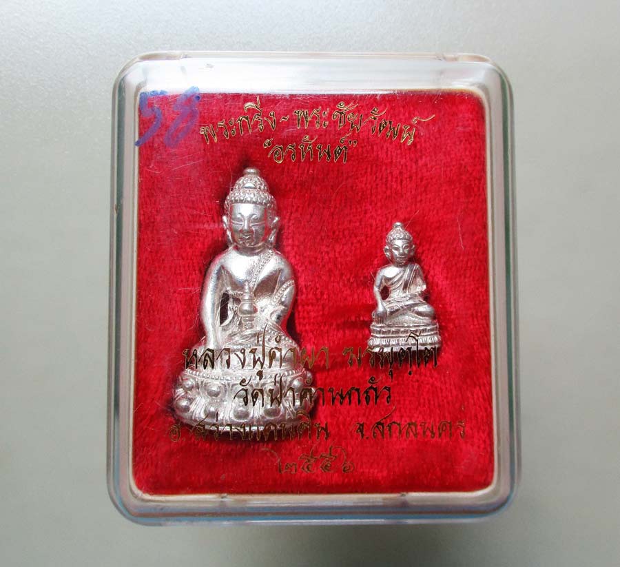 พระกริ่ง - พระชัยวัฒน์ รุ่น อรหันต์ ( รุ่นแรก ) หลวงปู่คำผา ฆรมุตฺโต วัดป่าคำนกถัว จ.สกลนคร พ.ศ.2556 เนื้อเงินขาว ตอกโค๊ต ตอกเลข ครบชุดกล่องเดิมๆ
