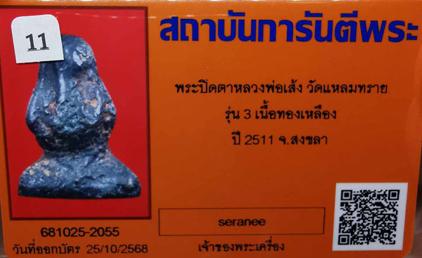 พระปิดตาหลวงพ่อเส้ง วัดแหลมทราย รุ่น3 เนื้อทองเหลือง ปี2511 จ.สงขลา + บัตร G-pra สภาพเดิมค่ะ