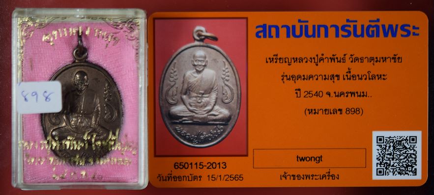 เหรียญหลวงปู่คำพัน วัดธาตุมหาชัย รุ่นอุดมความสุข เนื้อนวโลหะ หมายเลข 898 ปี 2540 จ.นครพนม พร้อมบัตรรับรองและกล่องเดิมๆ เคาะเดียวแดง