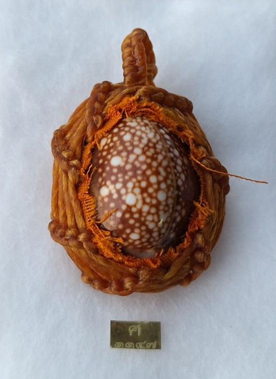 เบี้ยแก้ หุ้มจีวร ถักเชือก หลวงปู่ศิลา วัดโพธิ์ศรีสะอาด มีแผ่นเลขกำกับ ฝังตะกรุดทองเหลือง พร้อมใบคาถา ปี2567 |