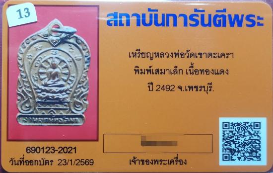 เหรียญเสมาเล็ก ลพ. วัดเขาตะเครา เนื้อทองแดง ปี2492 จ. เพชรบุรี มาพร้อมบัตรรับรอง