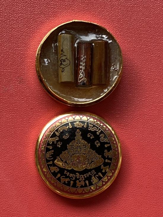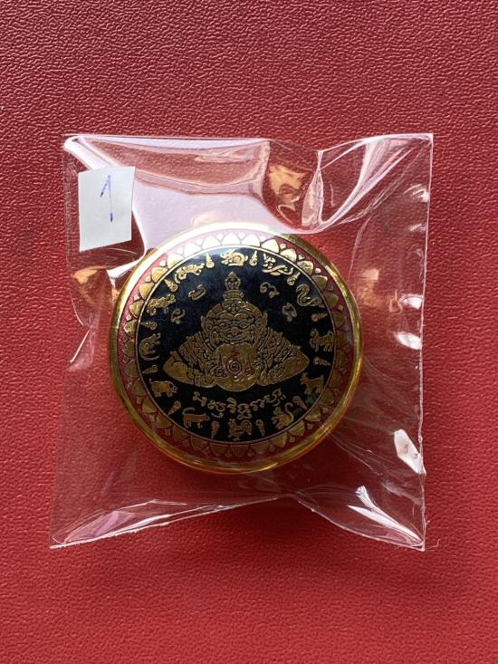 เคาะเดียวแดง สีผึ้งพระราหู รุ่น มงคลจักรวาล เนื้อ โลหะชุบทองลงยาสีดำขอบสีแดง ขนาด 3.2ซม |