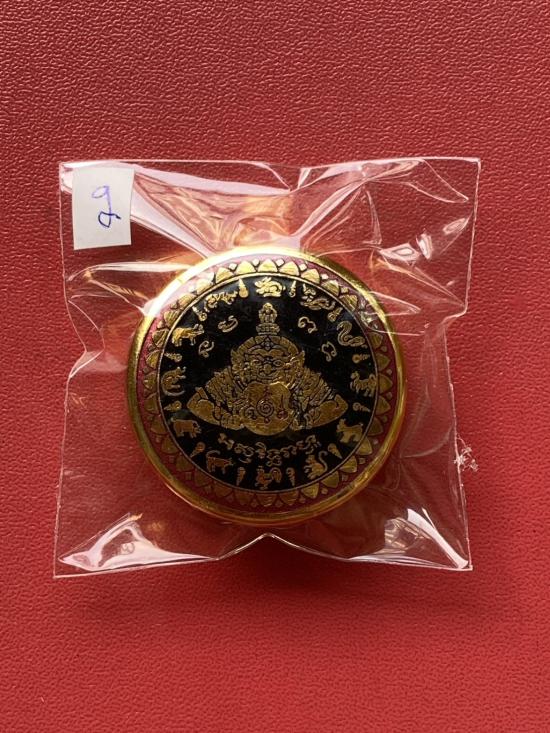 เคาะเดียวแดง สีผึ้งพระราหู รุ่น มงคลจักรวาล เนื้อ โลหะชุบทองลงยาสีดำขอบสีแดง ขนาด 3.2ซม |
