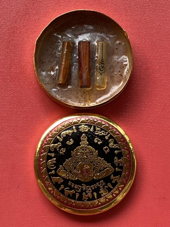 เคาะเดียวแดง สีผึ้งพระราหู รุ่น มงคลจักรวาล เนื้อ โลหะชุบทองลงยาสีดำขอบสีแดง ขนาด 5ซม |
