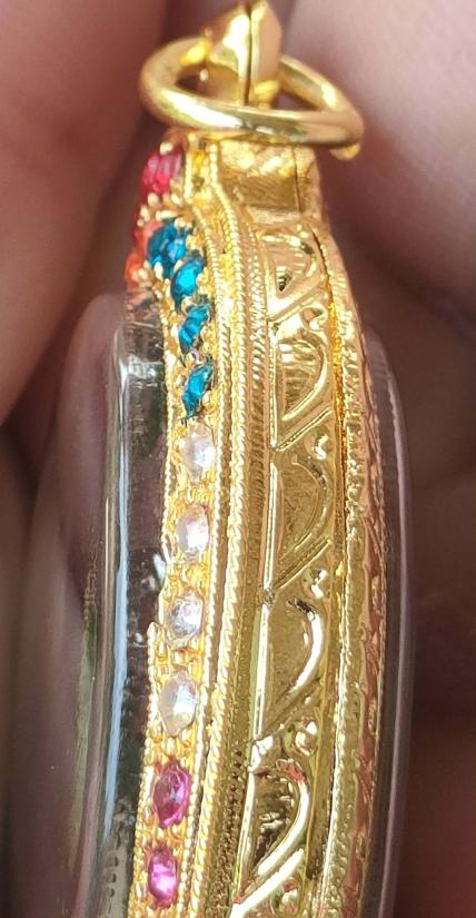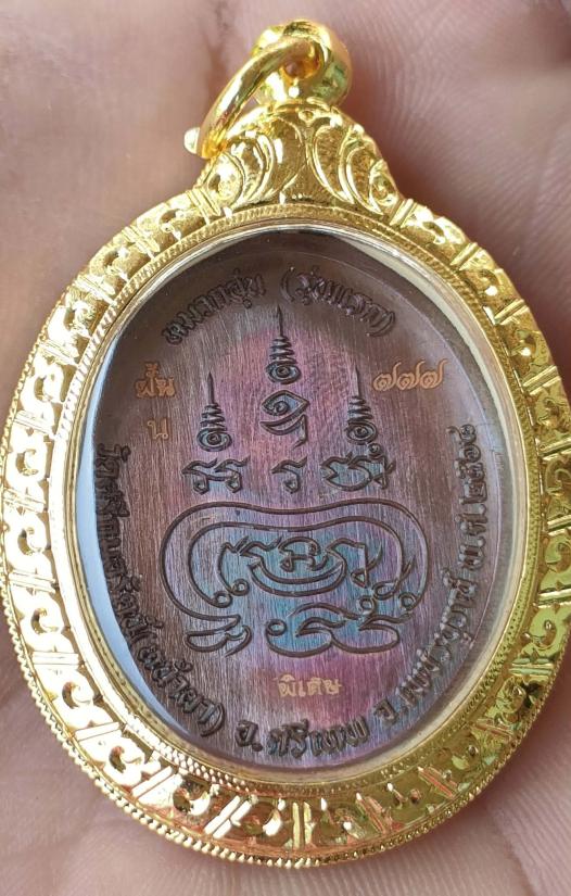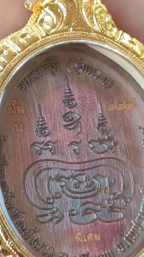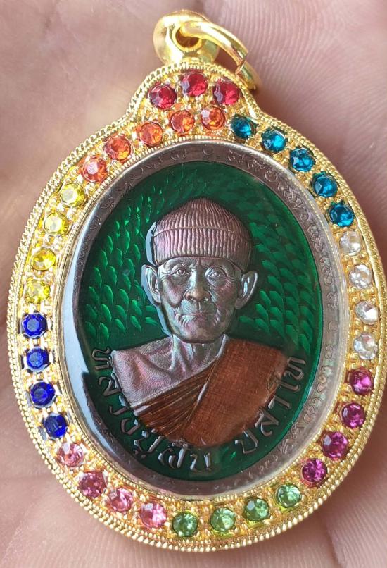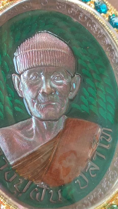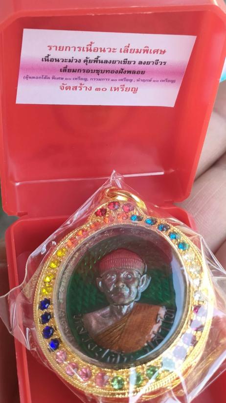 เหรียญหมวกอุ่น วาระ๘รอบ ๙๖พรรษา หลวงปู่ฝั้น ปสาโท วัดศรีถมอรัตนฺ์(วัดหน้าผา)เพชรบูรณ์ เนื้อนวะ คุ้ยพื้นลงยาเขียว ลงยาจีวร หลังยันต์มงกุฎ เลี่ยมกรอบชุบทองฝังพลอย เลขตอง ๗๗๗ พร้อมกล่อง เลขเจ้าสัว สวยๆ