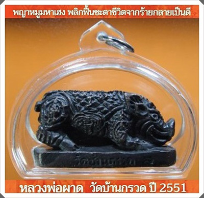 พญาหมูมหาเฮง พลิกฟื้นชะตาชีวิตจากร้ายกลายเป็นดี หลวงปู่ผาด ไตรมาส ปี2551 เนื้อโลหะ ตะกรุด 3 ดอก วัดบ้านกรวด บุรีรัมย์ เลี่ยมพร้อมใช้ |