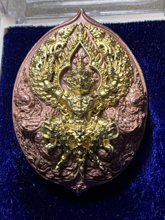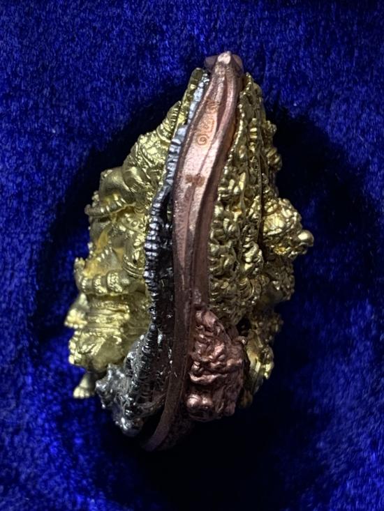เหรียญหล่อ พระพิฆเนศ-พญาครุฑ จิตสมปรารถนา องค์ทองระฆัง ลายกนกเงินยวง แผน่หลังทองแดงพ่นทราย สวยมาก เคาะเดียวครับ