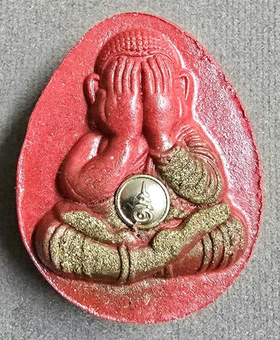 พระปิดตา "เศรษฐีเหนือดวง" วัดโพธิ์ศรีสะอาดแกเปะ จ.กาฬสินธุ์ (พระรุ่นนี้ปลุกเสก 3 วาระ และในวาระแรก หลวงปู่มหาศิลา ปลุกเสกอธิฐานจิตให้) เนื้อแดงว่านสบู่เลือด เม็ดสะดืออุนาโลม(อัลปาก้า) หลังหน้ากากดวงน