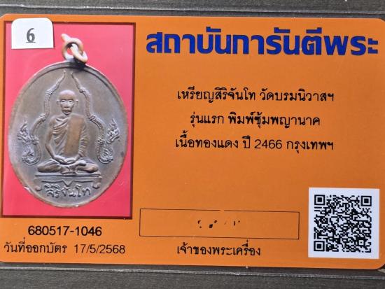 เหรียญสิริจันโท รุ่นแรก พิมพ์ซุ้มพญานาค พ.ศ.2466 (เหรียญเกือบ100ปี)วัดบรมนิวาสฯ กรุงเทพ พร้อมบัตรรับรอง
