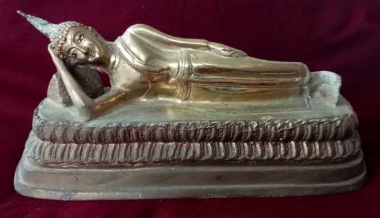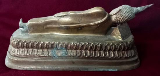 พระบูชา ปางไสยาสน์ ขนาดฐานเหลี่ยมประมาณ 10 นิ้ว 2 หุน X 3 นิ้ว 6 หุน ประทับนอนบนบังลังก์บัวคว่ำบัวหงาย เนื้อทองเหลืองเก่าคร่ำ เกิดสนิมหยกประปราย ผิวหิ้ง ตามุก ใต้ฐานมองเห็นแกนลวดหุ่นพระและเศษดินฝรั่ง สภาพสวยตามรูป ส่งฟรีทั่วไทย รับประกันตามกฎครับ