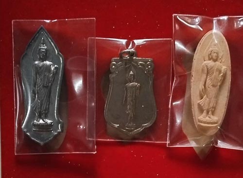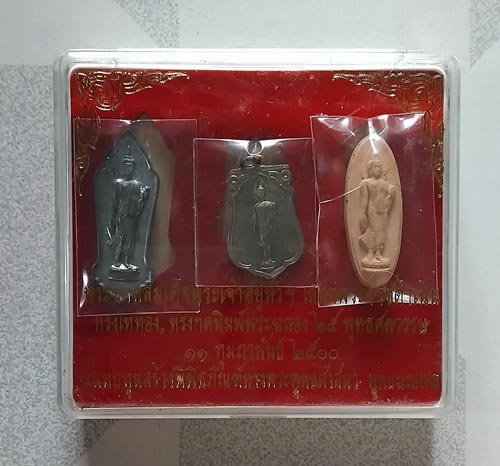 พระพุทธลีลา 25 พุทธศตวรรษ ปี 2500 (ครบชุด 3 องค์) พร้อมกล่องเดิม และ ใบฝอย..หายาก