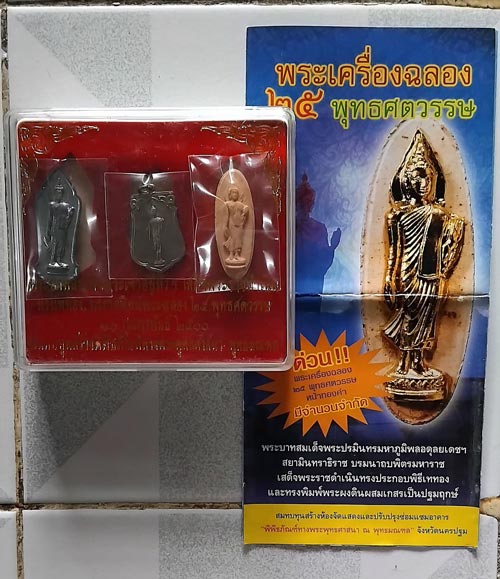 พระพุทธลีลา 25 พุทธศตวรรษ (ครบชุด 3 องค์) ปี 2500 พิธีใหญ่มาก พร้อมกล่องเดิมและใลฝอย