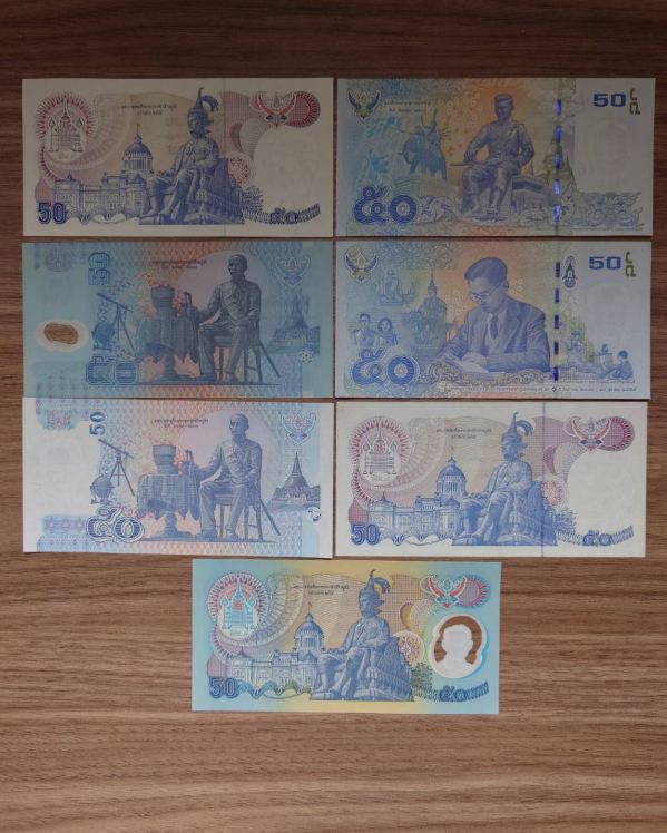 ชุดธนบัตร50บาท ในยุคสมัยรัชกาลที่9 จำนวน7ใบ 7แบบ สภาพไม่ผ่านการใช้งาน ใบที่1.แบบ13 ลายน้ำในหลวง ร.9 หลังพระบาทสมเด็จพระปกเกล้าเจ้าอยู่หัว ใบที่2.แบบ15.1 โพลิเมอร์ หลังพระบาทสมเด็จพระจอมเกล้าเจ้าอยู่หัว ใบที่3.แบบ15.2 กระดาษ หลังพระบาทสมเด็จพระจอมเกล้าเจ้าอยู่หัว ใบที่4.แบบ16 สมเด็จพระนเรศวรมหาราช ใบที่5.แบบ16.5 หลังพระบาทสมเด็จพระปรมินทรมหาภูมิพลอดุลยเดช ใบที่6.เหมือนแบบ13 แต่เป็นลายน้ำสมเด็จย่า ใบที่7 โพลิเมอร์ ฉลองสิริราช รวมทั้งหมด7ใบ เลขไม่ตรงกัน
