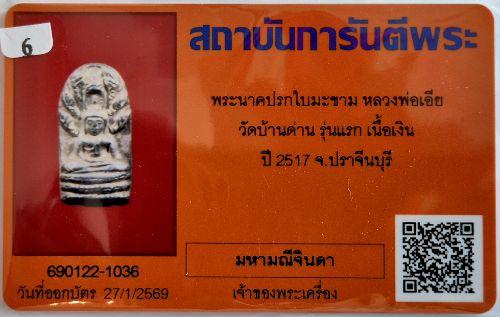 พระนาคปรกใบมะขาม หลังธรรมจักร หลวงพ่อเอีย เนื้อเงิน รุ่นแรก ปี 2517 หายากมาก พร้อมบัตรรับรองครับ