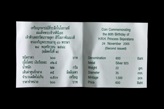 เหรียญเงิน 600 บาท สมเด็จพระเจ้าภคินีเธอ เจ้าฟ้าเพชรรัตนราชสุดา 80 พรรษา