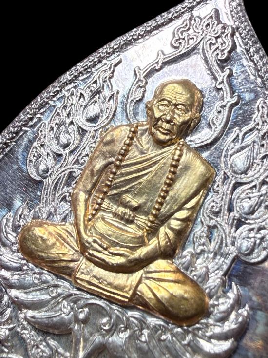 เหรียญใบโพธิ์ " รุ่นรวยโชคลาภ เจริญยศ เจริญลาภ " หลวงปู่คำบุ วัดกุดชมภู จ.อุบลราชธานี ปี 2551 เนื้อเงินหน้ากากทองคำ หลังเรียบมีจาร (ตอกโค๊ต "คำบุ" หมายเลข 10) สวยมาก