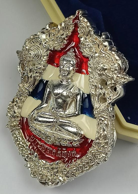 เหรียญหล่อฉลุ (บรรจุกริ่ง) พระพุทธสิหิงค์ "กริ่งวินยาภรณ์ 26 ศตวรรษ" วัดพระมหาธาตุ จ.นครศรีธรรมราช เนื้อเงินลงยาลายธงชาติ เบอร์ 253 พร้อมกล่องเดิมครับ (น้ำหนัก28.24กรัม)