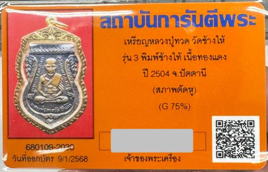 เหรียญเสมารุ่น 3 หลวงพ่อทวด บล็อคลึกช้างไท้ บัตรระบุตัดหูครับ พร้อมบัตรรับรอง ทองเลี่ยมมาหมื่นกว่าครับ