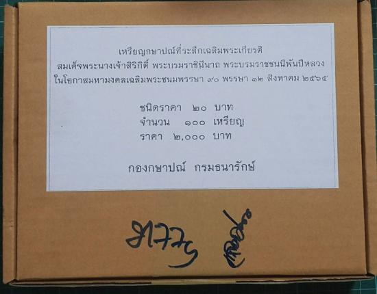 เหรียญกษาปณ์ที่ระลึกเฉลิมพระเกียรติ สมเด็จพระนางเจ้าสิริกิติ์ พระบรมราชินีนาถ พระบรมราชชนนีพันปีหลวง ในโอกาศมหามงคลเฉลิมพระชนมพรรษา 90 พรรษา 12 สิงหาคม 2565 ผลิตวาระสุดท้ายของราชินีครับ ชนิด ราคา 20 บาท จำนวน 100 เหรียญ สภาพไม่ผ่านการใช้งาน UNC พร้อมตลับ กล่องเดิมจากกองกษาปณ์ กรมธนารักษ์ ครับ