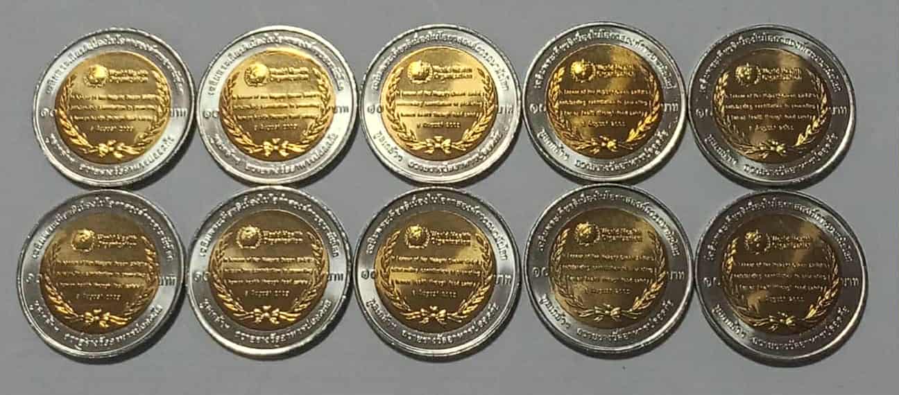 เหรียญ 10 บาท สองสี ที่ระลึกสมเด็จพระนางเจ้าสิริกิติ์พระบรมราชินีนาถพระพันปีหลวง เนื่องในโอกาสองค์การอนามัยโลกทูลเกล้า ถวายรางวัลอาหารปลอดภัย 8 สิงหาคม 2548 เหรียญไม่ผ่านใช้งานแกะถุง จำนวน 10 เหรียญ ส