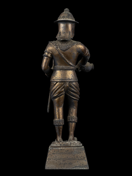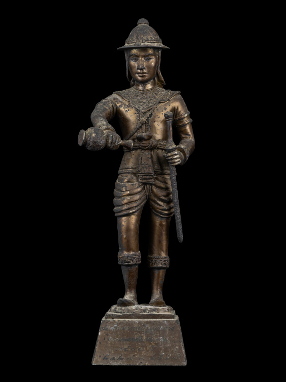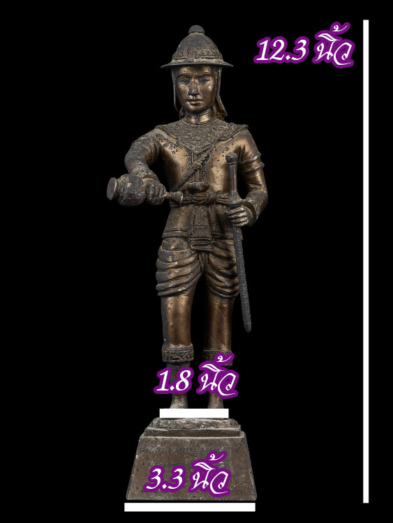 สมเด็จพระนเรศวรมหาราช ทรงประกาศอิสสระภาพ 400 ปี ( ยืนหลั่งน้ำสิโนทก ) ณ.วัดพรหมสุวรรณสามัคคี พ.ศ.2527 สูงรวมฐาน 12 นิ้ว เนื้อโลหะรมมันปู ผิวหิ้ง 2 ถอด !!
