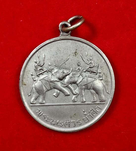 เหรียญพระนเรศวรย่ำศึก วัดป่าสุพรรณบุรี หลวงพ่อถิร หลวงพ่อมุ่ยร่วมปลุกเสก เนื้ออัลปาก้า สร้างปี พ.ศ. 2513