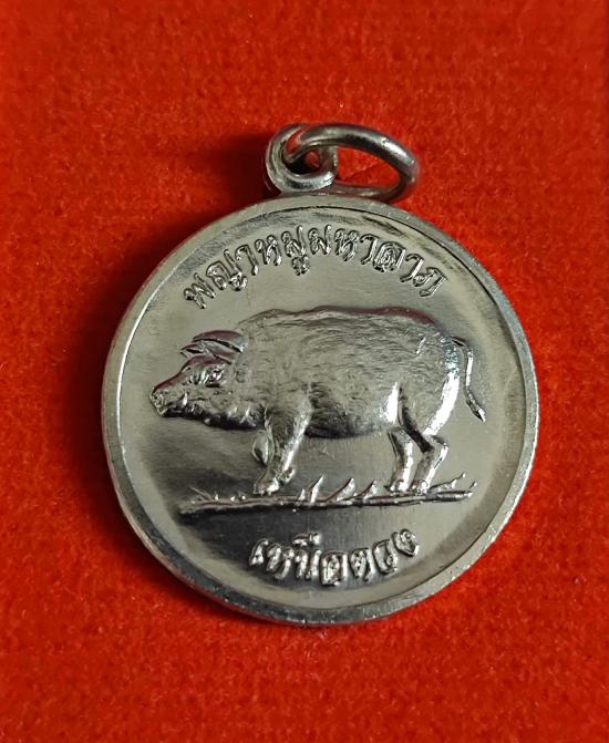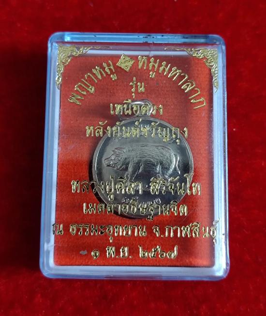 หลวงปู่มหาศิลา สิริจันโท ธรรมอุทยาน จ.กาฬสินธุ์ พญาหมูมหาลาภ รุ่น เหนือดวง หลังยันต์ขวัญถุง เนื้ออัลปาก้า