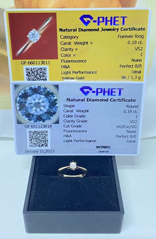 แหวนใหม่ไม่ผ่านการใช้สภาพสวย เพชรแท้0.18ตัง Yellow Goldทองแท้9k/37.5% แหวนเบอร์52 พร้อมบัตรรับรองG-Phet ให้2ใบ